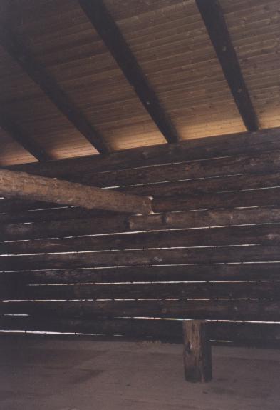 This is what the interior looked like after we got done hefting in that log. Even in this very dark photo, you can see how nice the underside of the roof looks. This is why we went to all the trouble to put the insulation on top. We finished the 2x6 TnG with a clear satin sealer before we nailed them up because they're much harder to work on from the bottom side. The loft log will form the front edge of the second floor. The area to the right of the log (in this picture) will remain open to the ceiling. The area to the left will be the loft and will have a railing to prevent small children from falling and spoiling everybody's fun. The area we're looking at right now will become the kitchen. |