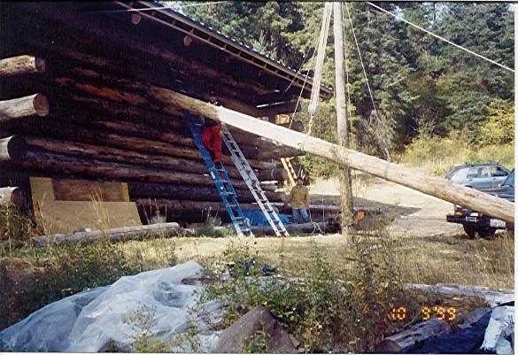 After we finished the roof and the main floor, we had to put in a log to act as the front beam of the second story loft. I could have put it in during the wall contruction but for various reasons I thought it would be easier to do later. Amazingly, this turned out to be true. All we did was cut two holes in the walls in the places that we wanted the log to sit. We planted one of my old lifting poles in the ground 15' from the wall and rigged it up with two lifting systems (you can see them both in this picture). We used the jeep winch to do the actual lifting and a rope system to hold the log in place while we moved the lifting point. Then a come-along to pull the log into the hole. Once half of the log was inside the house we switched to lifting off the ridge pole and put the come-along on the top of the far wall. We were very surprised how well this worked. |